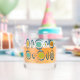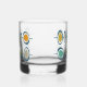 Add a pop of color to your kitchen or bar cart with this fantastic retro whiskey glass. It features abstract hanging geometric circles in the colors of turquoise blue, orange, avocado green, tan, gold, and blue.