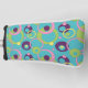 Der hellblaue Hintergrund ist mit einem trendigen Muster von Kreisen, Punkten und Ringen in verschiedenen lebhaften Farben, darunter Rosa, Grün, lila und Gelb, geschmückt.