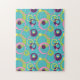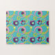 Der hellblaue Hintergrund ist mit einem trendigen Muster von Kreisen, Punkten und Ringen in verschiedenen lebhaften Farben, darunter Rosa, Grün, lila und Gelb, geschmückt.