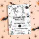 Funky Quirky Whimsical Hand Drawn Halloween-Party Einladung - Kostüme und Cocktails - Schwarz-Weiß Retro inspiriert handgezeichnetes lustiges Halloween-Party laden. Klassisch schwarz-weiß mit tanzenden Skeletten mit Cocktailgetränken, Kürbislaternen, Spinnennetz, Diskokugel, spukigen Geistern, Martini-Glas und Weinflasche. Passen Sie diese bearbeitbare Einladungs-Vorlage mit Ihren eigenen Ereignisdetails an. Alle Texte können bearbeitet werden.