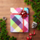 Eine Rolle Wickelpapier mit einem farbenfrohen karierten Muster in Regenbogenfarben.