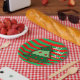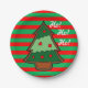Festliche, kühn rot-grüne Stripey Weihnachtspapier Party Teller mit Weihnachtsbaumdesign.