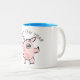 Funny Cartoon Illustration von ein wenig piik Schweinetanz und Lachen (Abbildung Nr. 5) auf transparentem Hintergrund mit anpassbaren Texten: Happy New Year und 2019. Sie können den Text (Schriftart, Größe, Farbe und Position) ganz einfach ändern, indem Sie auf die Schaltfläche Anpassen klicken. Design auf zweifarbiger (weiß und blau) Keramik Tasse. Erhältlich mit anderen lustigen Cartoon-Illustrationen. Ideal für Chinesisches Neujahr des Schweins 2019 oder Geburtstag (Leute geboren im Schweinejahr). — "Das Schwein (豬) ist das zwölfte und letzte Zeichen der Irdischen Zweige (亥). Im kontinuierlichen Sexagenenzyklus entspricht jedes zwölfte Jahr Hai und wird gemeinhin als "Jahr des Schweins" (豬 年) bezeichnet. Es gibt fünf Arten von Schweinen, die nach den chinesischen Elementen benannt sind. In der Reihenfolge sind sie: Metall, Wasser, Holz, Feuer und Erde. Im japanischen Zodiac und im tibetischen Zodiac wird das Schwein durch das Schwein ersetzt[1]. Im Dai-Zodiac wird das Schwein durch den Elefanten ersetzt. Im Zodiac Gurung wird das Schwein durch das Hirsch ersetzt. (..) Man kann sagen, dass Personen, die innerhalb dieser Zeitbereiche geboren sind, im "Jahr des Schweins" geboren waren, und dabei auch das folgende Elementarzeichen tragen: 10. Februar 1923 - 29. Januar 1924 = Wasserschwein, 4. Februar 1935 - 23. Januar 1936 = Holzschwein, 2. Januar 19 47 - 9. Februar 1948 = Feuerschwein, 8. Februar 1959 - 27. Januar 1960 = Erdschweine, 27. Januar 1971 - 14. Februar 1972 = Metallschwein, 13. Februar 1983 - 1. Februar 1984 = Wasserschwein 31. Januar 1995 - 18. Februar 1996 = Holzschwein, 18. Februar 2007 - 6. Februar 2008 = Waldschweine, 5. Februar 2019 - 24. Januar 2020 = Erdschweine, 23. Januar 2031 - 1 20 032 = Metal Pig (...)" Wikipedia