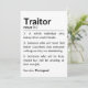 Eine humorvolle Definition von "Verräter" wird als Wörterbucheintrag mit einem sarkastischen Ton dargestellt, was darauf hindeutet, dass der Begriff auf einen geschätzten Mitarbeiter verweist, der für eine neue Arbeit verlasse. Er markiert den abfliegenden Mitarbeiter spielerisch als Verräter für den verlass von Freunden, erkennt aber auch ihr Potenzial für Größe in ihrer nächsten Rolle an.