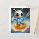 Eine lustige Alien über ein schwimmendes Ei im Raum hält eine Gabel und einen Kaffee