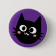 Das lila Abzeichen mit einem komischen Cartoon, einer schwarzen Katze mit großen runden Augen und rosafarbenen, rosa Wangen im Doodle zeichnend Kunststil.