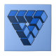 Holen Sie sich diese wunderschöne Keramik Kachel mit diesem unmöglichen Dreieck aus schwarz-blauen Würfeln auf blauem Hintergrund. Ein unmögliches Dreieck in Form von blauen Würfeln. Auch bekannt als unmögliche Transformation oder unmögliche Konstruktion. Sie werden viele im Internet finden, aber ich denke, meine ist sehr gut ausgeführt.