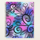 Ein lustiger kleiner Vogel, schöne Blumenelemente und ein kleines Herz auf einem rosa, lila und türkisfarbenen Hintergrund.