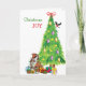 An der Vorderseite dieser Weihnachtskarte sieht ein niedlicher brauner und weißer Bulldog auf eine Stierhütte, die auf dem Holiday-Baum landet. Der Hund ist in eine Reihe von Baumleuchten eingewickelt, und die hellen Geschenkpackungen sind verstreut. Der rote und grüne Text sagt "Christmas JOY". Inside ist stilisierter Text, der MERRY CHRISTMAS sagt, und ein Textfeld für Sie anpassen.