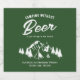 Humorvolle Bachelorette-Camping-Flaschenschilder mit einem zeichn eines Campingplatzes mit Bergen, Bäumen, einem Holzfeuer, einem Zelt, dem witzigen Sprichwort "Camping ohne Bier, sitzt nur im Wald" und einer bearbeitbaren Textvorlage.