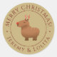 Send these funny capybara reindeer Christmas Round Stickers with a holiday gift to your friend, family member, or loved one. The gold sticker design features a capybara illustration in the center with personalized 'Merry Christmas and name' in red color perfect for capybara lovers. The capybara illustration is hand-drawn original artwork by artbybiyan.