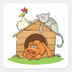 Funny Cartoon Dog Cat and Chicken on Doghouse Quadratischer Aufkleber