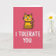 This very funny greeting card features a golden-yellow cartoon cat centered near the top, outlined in black with a few darker stripes. The cat has half-closed eyes, a tiny smirk, and light pink blush on its cheeks, giving it a dry, affectionate look. Behind the cat is a solid fuchsia background that makes the yellow fur stand out right away. Near the bottom, the card says “I TOLERATE YOU” in white block letters, set in a simple sans-serif style. The text sits straight across the lower part of the card and feels like the punchline to the cat’s expression. It’s a funny, slightly sarcastic way to say you care, perfect for a partner, friend, or anyone who gets your sense of humor ❤️💌. Pair it with a little treat and you’ve got a sweet-and-sassy moment 🍫.