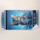 Strandtuch mit niedlichem Kätzchen im Wasser, das zum Schwimmen einlädt. Der Hintergrund ist ein marineblau gestreiftes Design. Ideal für den Pool oder den Strand.