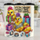 Diese humorvolle Abbildung zeigt eine Gruppe von Babyküken, die versuchen, Geschenke zu verpacken. Ein Küken ist mit einem lila Bogen in Klebeband verpackt, während ein anderes auf dem Boden liegt, erschöpft. Ein Schild darüber lautet: "ES IST DER GEDANKENSTAND, DER ZÄHLT...", was eine lustige und sarkastische Aufnahme in das Geschenkverpacken eines Urlaubs darstellt.