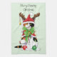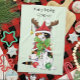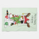 Niedliche Kalico-Katze gekleidet in Weihnachtsbeleuchtung, gestopfte Antlers, Weihnachts-Weihnachtsmannmütze, und ein großer grüner Bogen vor einem Hintergrund von hellgrün, das Kätzchen ist nicht glücklich!
