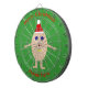 Dieses phantastische Dartboard bietet einen lustigen Cartoon eines Eis mit Armen und Beinen. Das Ei hat Arme und Beine und ein kleiner Riss im Kopf, der das weiße Innere aussetzt. Es hat blaue Augen mit einem schwarzen Schüler und ein großes Lächeln, wo das Eigelb des Eis zu sehen ist. Die Muschel sieht rau aus. Dieses Weihnachtseii trägt eine Weihnachtsmannmütze, die bereit ist, in dieser Weihnachtszeit Party.