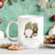 Weihnachts-Tasse mit einem niedlichen und lustigen Urlaubsknom mit einem Olivenhain und stehend neben einem Baum mit Ornamenten und Bonbons. Im Text steht: "Es gibt keinen Ort wie gnome für die Ferien." Mit Kakao, Süßigkeiten oder kleinen Leckereien ausgestattet, ist dies ein perfektes Geschenk für Familienmitglieder und Freunde.