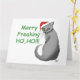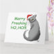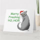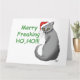 Eine graue Katze mit einer roten Weihnachtsmannmütze. Die graue Katze ist grauenhaft über Weihnachten