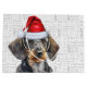Hundefreunde werden diese niedliche Weihnachtsgeschenktüte mit niedlicher drahthaariger Dackel in einer Weihnachtsmannmütze auf einem witzigen WOOF! Wortkunsthintergrund in zarten Grautönen auf weißem Untergrund genießen.