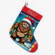 A funny Bigfoot personalized Christmas stocking with a comic book style pop art sasquatch smiling with a Santa and Christmas lights on.