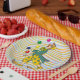 Funny Clown spielen mit farbenfrohen Balls Pappteller