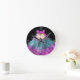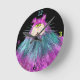 Fun Wall Uhr, mit Grafiken einer lustigen bunten Katze, vor einem schwarzen Hintergrund und farbigen Stundenzahlen. Gute Uhr für alle Katzenliebhaber.