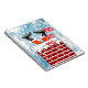 Der sonnige Weihnachtsmann steckt im Kaminheft fest, dieses Design hat einen blauen Himmelshintergrund mit Schnee und Schneeflocken