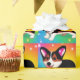 Funny Corgi Puppy Dog with green, yellow, blue and more colors in the background.