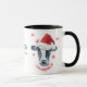 Hier ist eine lustige Holiday Tasse, die eine schwarz-weiße Kuh mit einer rot-weißen Weihnachtsmannmütze zeigt. Rund um das Kuhportrait sind verzierte Schneeflocken. Am unteren Rand befindet sich der benutzerdefinierte Text, der derzeit "Cowabunga!" sagt, und das grüne und rote Sprichwort "Frohe Weihnachten". Das Kuhbild ist auf zwei Seiten der Tasse, der Text dazwischen.