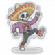 Colorful cartoon skeleton dancing joyfully in a sombrero and festive outfit. This playful character features a bright purple jacket, red bow tie, stylish pants, and red sneakers, celebrating with lively movement and musical notes. Perfect for Day of the Dead themes, Halloween designs, party decorations, stickers, t-shirts, greeting cards, and fun seasonal graphics with a cheerful, animated vibe.