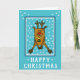 Funny Deer Star Muster Frohe Weihnachtskarte. Niedliches, lustiges Hirsch mit roter Nase und einer Glocke auf dem Hals auf blauem Hintergrund mit weißen Sternen.