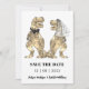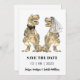 Freuen Sie sich auf diese lustige Dinosaurier-Hochzeit T Rex Braut und Bräutigam Save the Date. Einfach mit den Namen der Braut und der Zelthäute und dem Hochzeitstermin anpassen. Fun Aquarell T Rex Braut und Bräutigam Illustrationen mit moderner Typografie. Einzigartiges Originalwerk von Catherine Sweetman