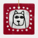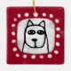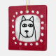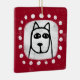 Ein niedlich gezeichnet Hund in Schwarz-Weiß auf einem rot strukturierten Hintergrund, umgeben von weißen Punkten.