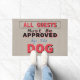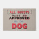 Familie und Freunde werden sich beim Lesen dieser lustigen und humorvollen Türmatte verzaubern. Moderne Begrüßungsgäste mit einer klaren Botschaft: Alle Gäste müssen vom Hund zugelassen werden. Moderne schwarz, rot, weiß und blau Typografie Stil lustige Zitat. Brauner Texturriss mit aussehendem Hintergrund.