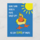 Eine lustige Ente für Kinder auf der Postkarte. "Wann wecke eine Ente auf? Am Rande des Morgens!" Cartoon Illustrationen auf blauem Hintergrund.