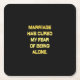 Fett gelber Text auf einem schwarzen Hintergrund: "Die Ehe hat meine Angst geheilt, allein zu sein." Das Design verwendet einen bedrückten Schriftart und betont einen spielerischen oder humorvollen Ton.
