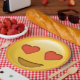 Diese lustige gelbe Papiertafel zeigt die glücklichen Emoji mit dem Ausdruck Liebe. Ideal für Kinder, Geburtstagsfeiern, Kinderbetreuung, Party und Party im sonnigen Garten.