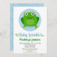 Die Einladung für das Baby-Sprinkle enthält einen lustigen grünen Frosch mit großen Augen auf einem blauen Spiralhintergrund.