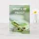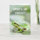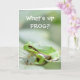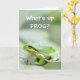 Grußkarte eines grünen Baumfrosches, sitzend auf Blätter mit dem Text: "Was ist los, Frog?", eine Analogie zu Bugs Bunny Sprichwort "Was ist los, Doc?" Sie können das an einen Freund schicken.
