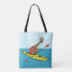 Ein lustiger Cartoon-Giraffe, der einen Kajak auf einem ruhigen blauen Meer paddelt. Ich zeichnete das inspiriert durch den lustigen Gedanken, dass ein so großes Tier in einem kleinen Boot ausbalancieren würde.