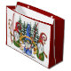 Diese lustige Weihnachtsgeschenk-Tasche hat drei lustige kleine Gnome, die Ihnen ein frohes Weihnachtsfest wünschen. Der Zwerggarn ist blau gekleidet und hat ein goldenes Banner mit rotem Text, das sagt: "Wir wünschen Ihnen ein frohes Weihnachtsfest". Auf beiden Seiten von ihm sind Gnomen in Rot und Grün gekleidet. Hinter ihnen befinden sich schneebedeckte Kiefern, und alles ist auf einem himmelblauen Hintergrund platziert. Beide Seiten der Tasche haben das gleiche Bild. Die Seiten der Tasche sind passend rot.