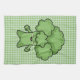 Niedlicher, grüner Cartoon Broccoli mit einem bezaubernden, glücklichen Gesicht. Der Hintergrund ist ein grün-weißes Gingham-Muster.