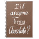 Dieses lustige Kunsttypografie-Notizbuch stellt eine der wichtigsten Fragen, die jeder gefragt haben kann: "Hat jemand Schokolade mitgebracht?" Dieses Funny Chocolate Braun Zitat ist ideal für den Chokoko in Ihrem Leben. Handgeschriebener schokoladenbrauner Zitat Spaß witziger Sprichwort-Slogan und Design von The Sweetmans