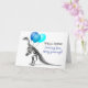 Moderne, sonnige Geburtstagskarte mit einem Skelett-Dinosaurier, der einige blaue Ballons mit dem Titel "WELL DONE - weil er vor vielen Jahren geboren war!" trägt. In der Nachricht heißt es Happy Birthday. Alle Texte können personalisiert sein.