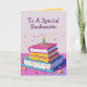 Eine lustige Karte für Buchwürmer, die Liebe zu lesen. Das Design auf der Vorderseite ist ein geschichteter Kuchen in Bücherform, mit Kerzen auf der Oberseite und Konfetti herumfliegen. Der im Text bearbeitbare Text lautet: "Ich hoffe, Sie legen Ihr Buch lang genug, um meine Karte zu lesen. Wenn du das nicht tust, wirst du nie wissen, welches Geld ich in diese Karte gesteckt habe.. Alles Gute zum Geburtstag". Es ist eine bunte Geburtstagskarte, die in Rosa, Orange, Gelb, Blau und lila ist.