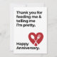 Das "Danke, dass du mir Gefüttert und mir erzählt hast, dass ich hübsch bin. "Happy Anniversary" ist ein humorvolles und charmantes Jubiläumsgeschenk, das Dankbarkeit und Liebe widerspiegelt. Es ist ideal für Jubiläen, Hochzeiten, Meilensteine und romantische Beziehungen. Das Design ist innen leer für eine persönliche Nachricht, die es zu einem nachdenklichen und niedlichen Geschenk für Ihren Partner macht.