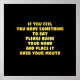 Fett gelber Text auf schwarzem Hintergrund empfiehlt humorvoll, die Hand zu heben, um den Mund zu bedecken, wenn Sie sprechen wollen.
