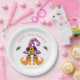 Diese niedlichen Halloween-Teller sind mit orangefarbenen Hexenfüßen versehen, die aus einem sternförmigen lila Hexenhut herausstechen. Kleine schwarze Fledermäuse mit grünen und goldenen Flügeln fliegen auf jeder Seite. Der orangefarbene Text sagt "Happy Halloween" in einem Halbkreis. Niedlich, besonders für Kinder, oder zu jedem Halloween-Fest. Grafiken von Prettygrafik Design, © Prettygrafik.com