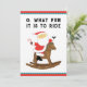 Kreative Weihnachtskarten zum Thema Pferd mit lustigem Cartoon Santa Claus, der hoch im Sattel reitet.